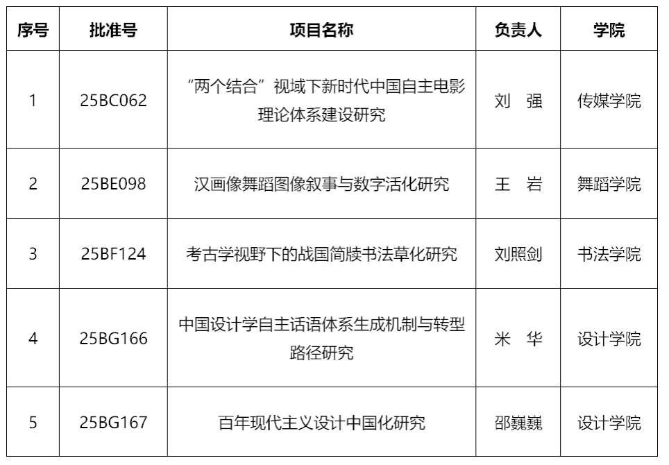 近日,文化和旅游部科技教育司、全国艺术科学规划领导小组办公室公布了2025年度国家社科基金艺术学项目立项名单,我校共有5项一般课题获批立项,立项总数再创历史新高,位列全省高校首位、全国高校第二位。