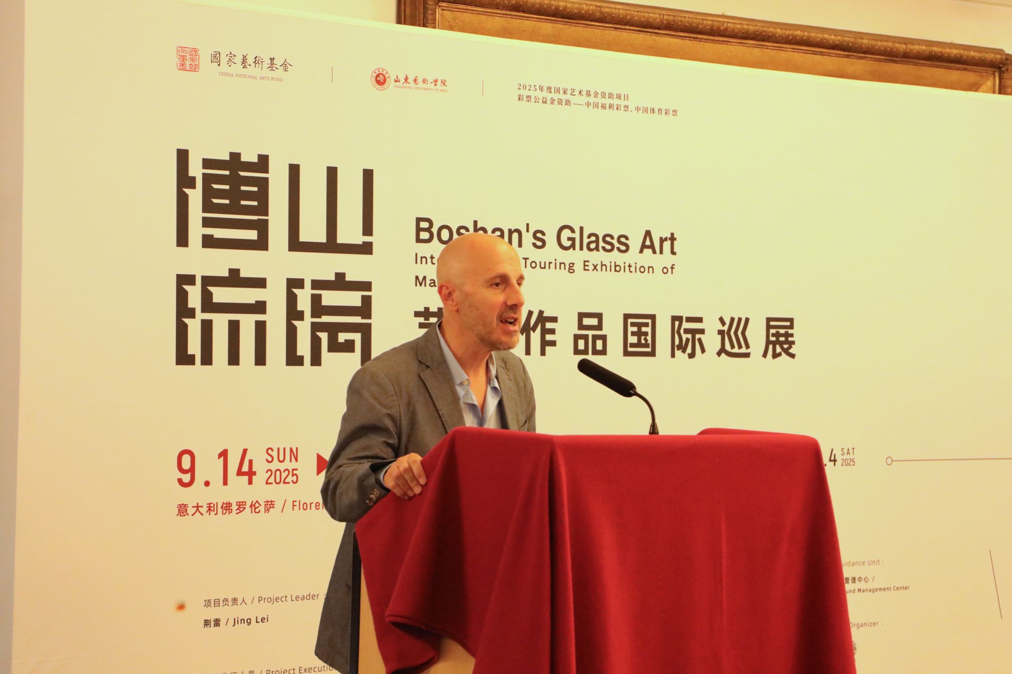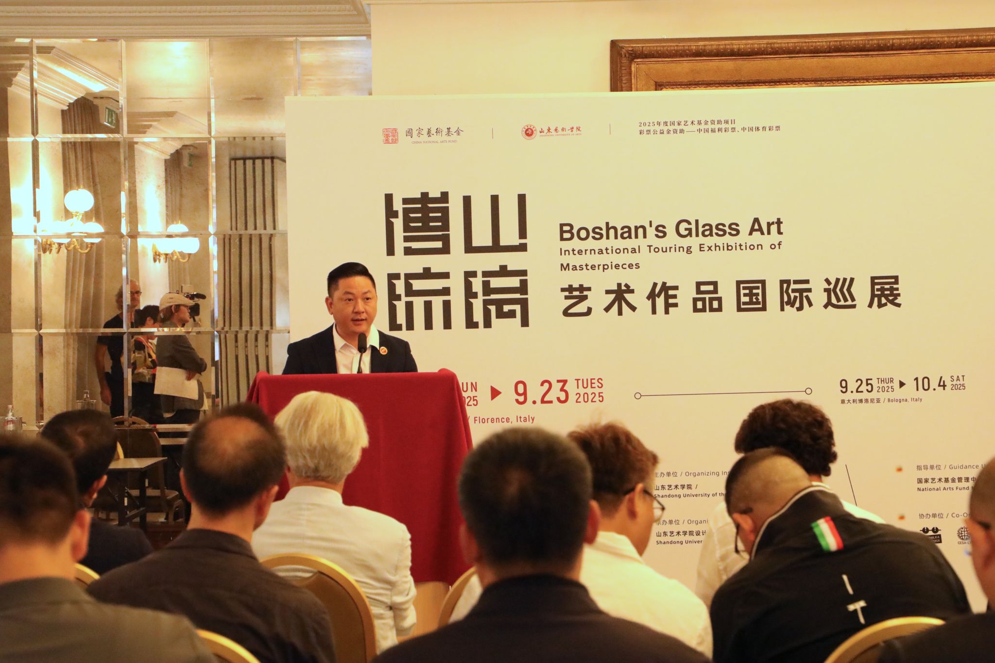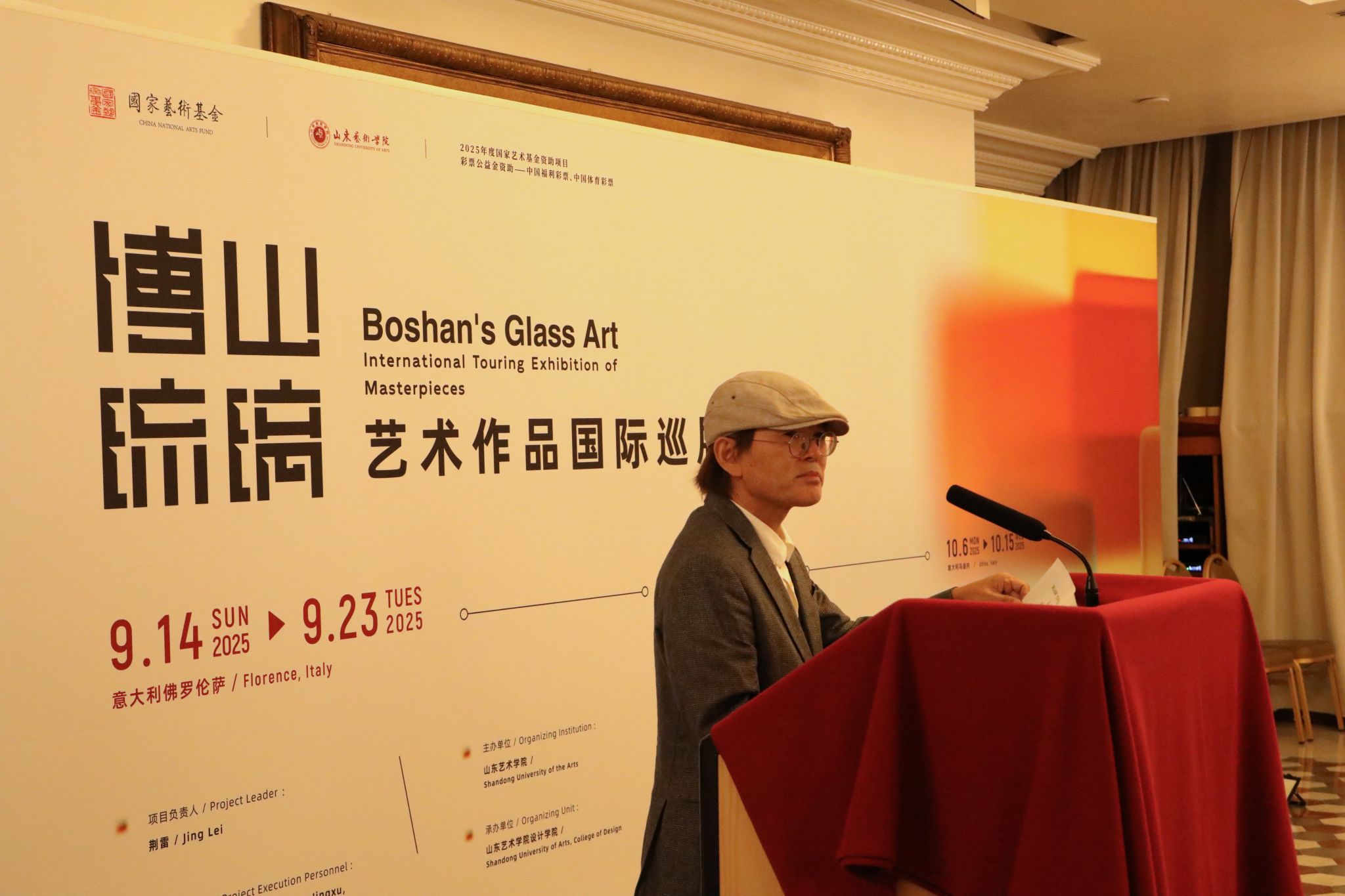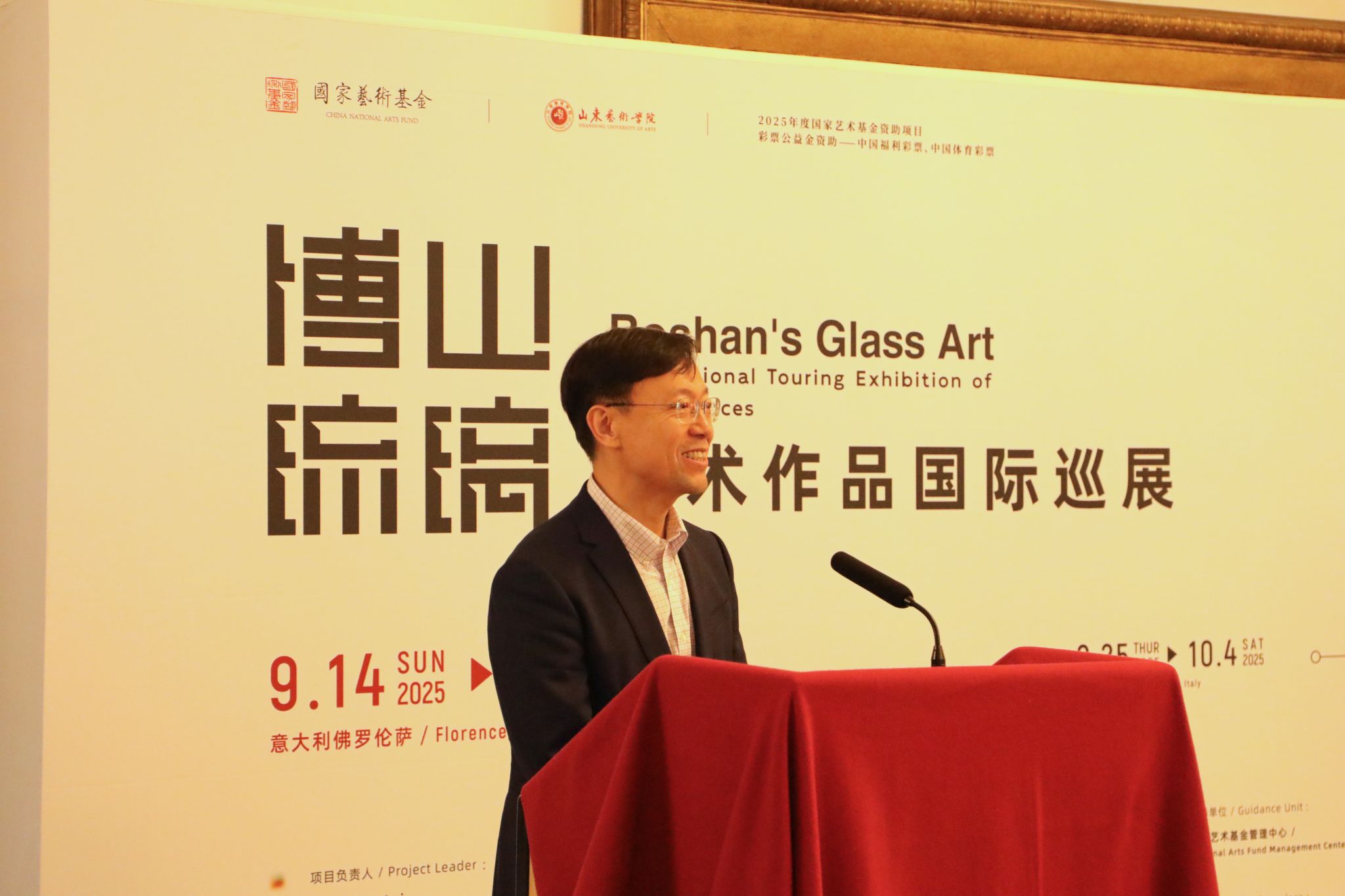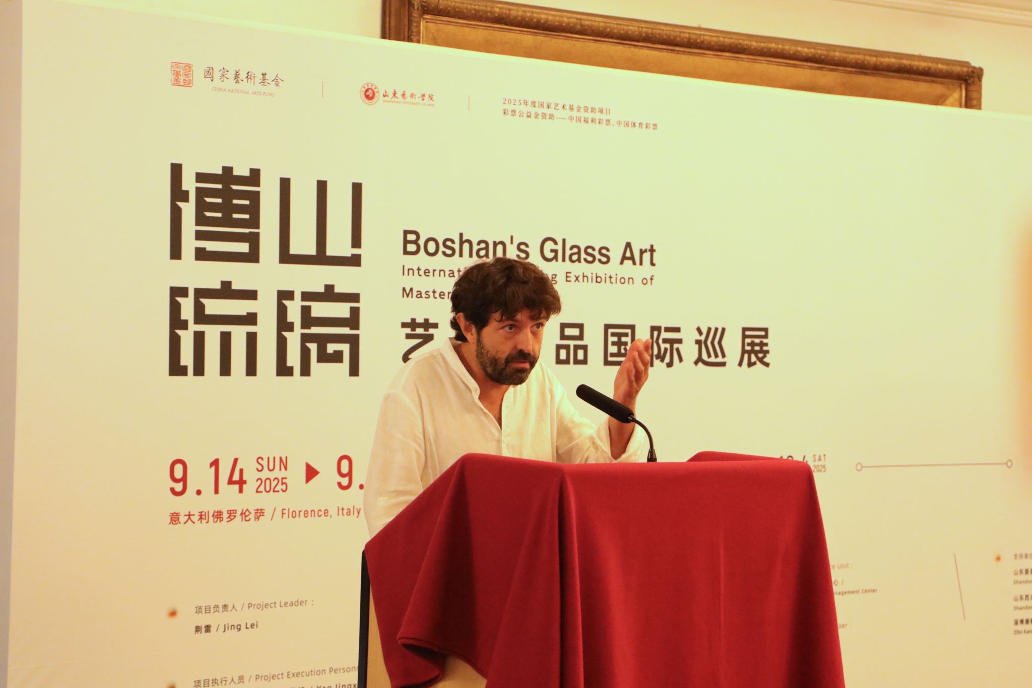 意大利当地时间2025年9月15日下午17点,由山东艺术学院主办的国家艺术基金2025年度传播交流推广资助项目“博山琉璃”艺术作品国际巡展开幕式在佛罗伦萨阿尔巴尼艺术馆举行,山东艺术学院设计学院院长远宏主持开幕式。
