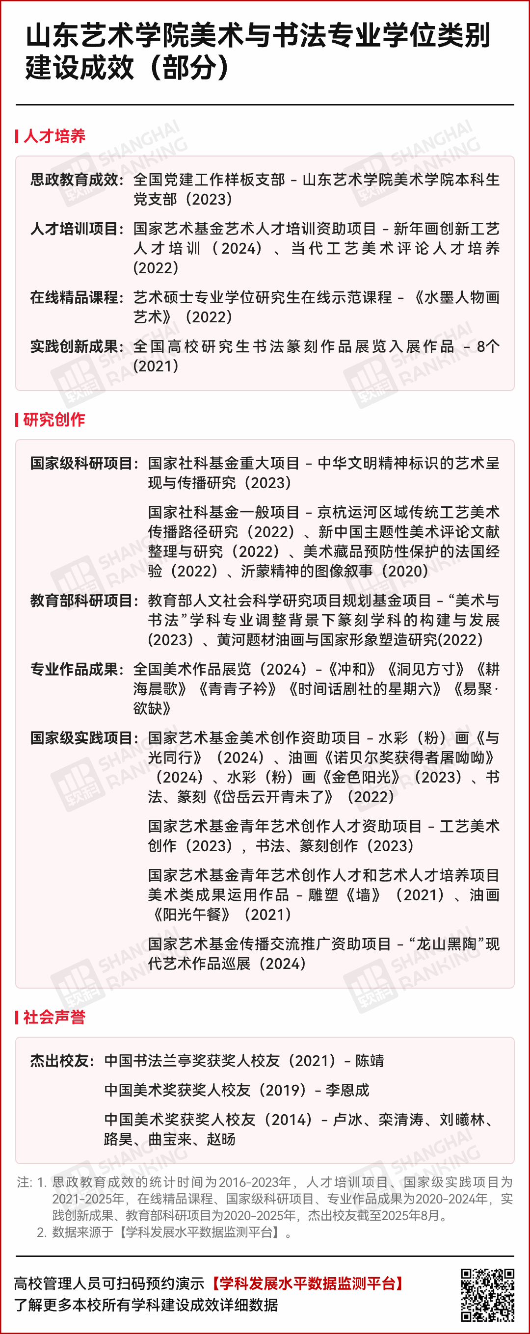 山东艺术学院美术与书法、戏曲与曲艺、戏剧与影视、音乐、舞蹈共5个学科上榜,实现了全面开花、100%上榜。其中美术与书法排名全国第17位、戏曲与曲艺排名全国第4位,双双入选“中国一流学科”,为建校67周年献上了一份厚礼!