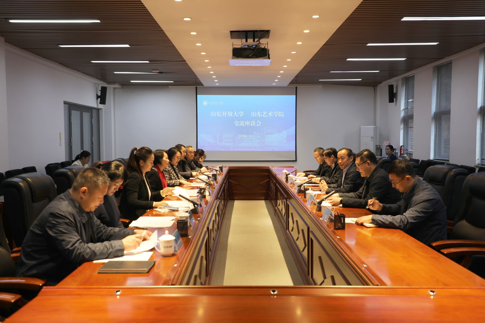 山东开放大学发展规划处、基建处、社区教育服务中心相关负责人及学校发展规划处、科研处、基建处、财务处、美术学院、艺术教育集团相关负责人参加了座谈。