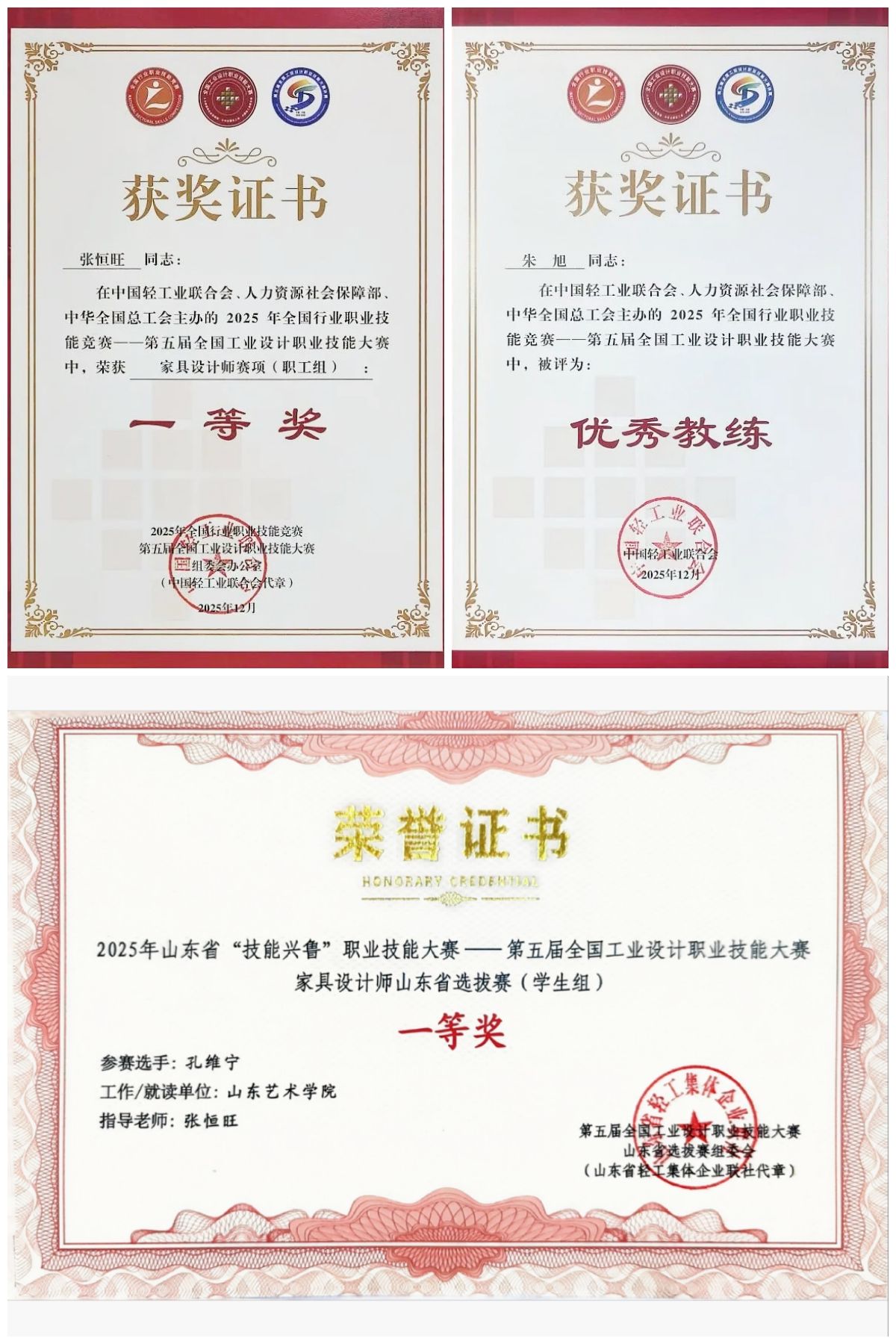 近日,第五届全国工业设计职业技能大赛决赛在浙江宁波举行。我校设计学院教师张恒旺获得家具设计师赛项(职工组)全国一等奖,2023级艺术设计专业研究生孔维宁获得家具设计师山东省选拔赛(学生组)一等奖,设计学院教授朱旭被评为优秀教练。