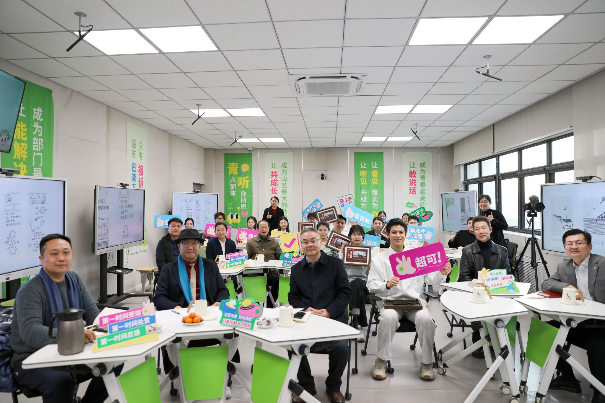 徐青峰在讲话中指出,学校始终坚持立德树人根本任务,以师生为中心,全心全意营造温暖育人环境,致力于全面提升学生的归属感、幸福感、获得感。他要求各单位、部门对同学们关心的“急难愁盼”问题,拿出切实可行举措,建立台账、限时落实、全程公开,切实做到“接诉即办、事事回应”。他寄语同学们要“敢发声、多参与、向远方”,以主人翁姿态助力学校建设发展,遇见更美好的山艺,成为更优秀的自己。