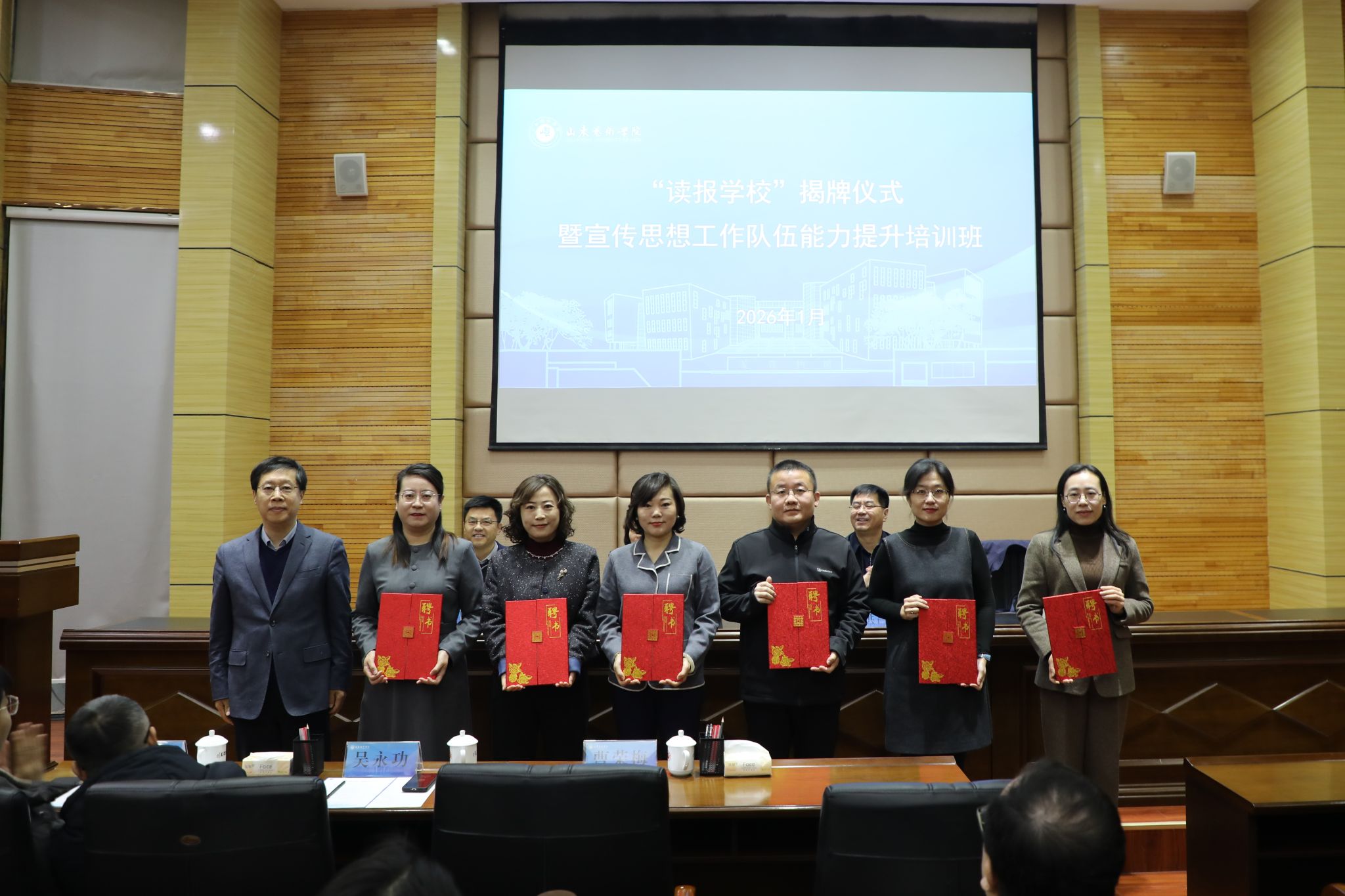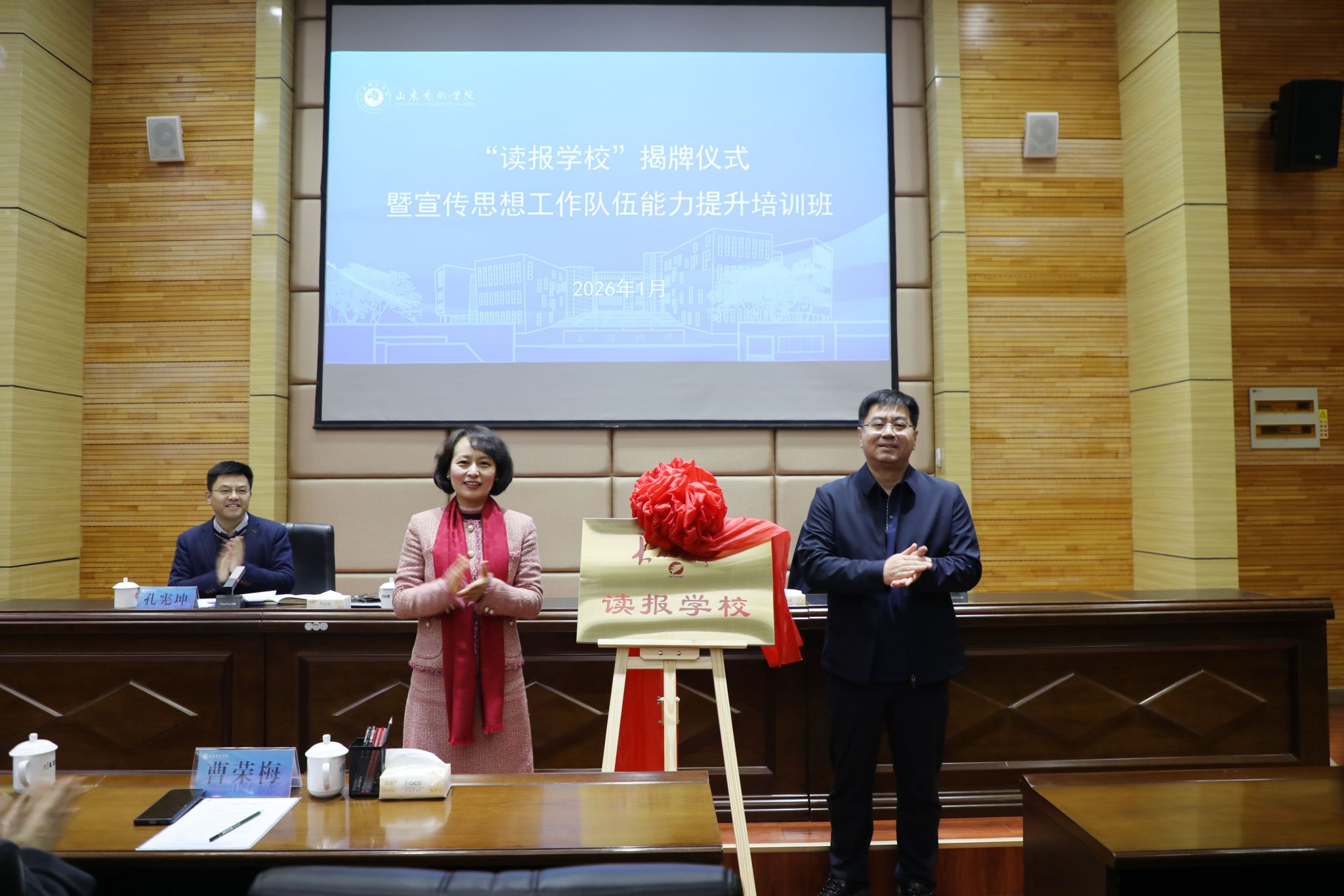1月29日至30日,学校与大众日报共建“读报学校”揭牌仪式暨学校宣传思想工作队伍能力提升培训班在长清校区办公楼报告厅举行。大众报业集团党委常委、副总编辑刘洪昌,大众报业(集团)发行有限公司总经理张伟,学校党委书记徐梅,党委委员、宣传部部长孔宪坤,各二级单位分管宣传与舆情工作的班子成员及师生代表共同参加。仪式由孔宪坤主持。