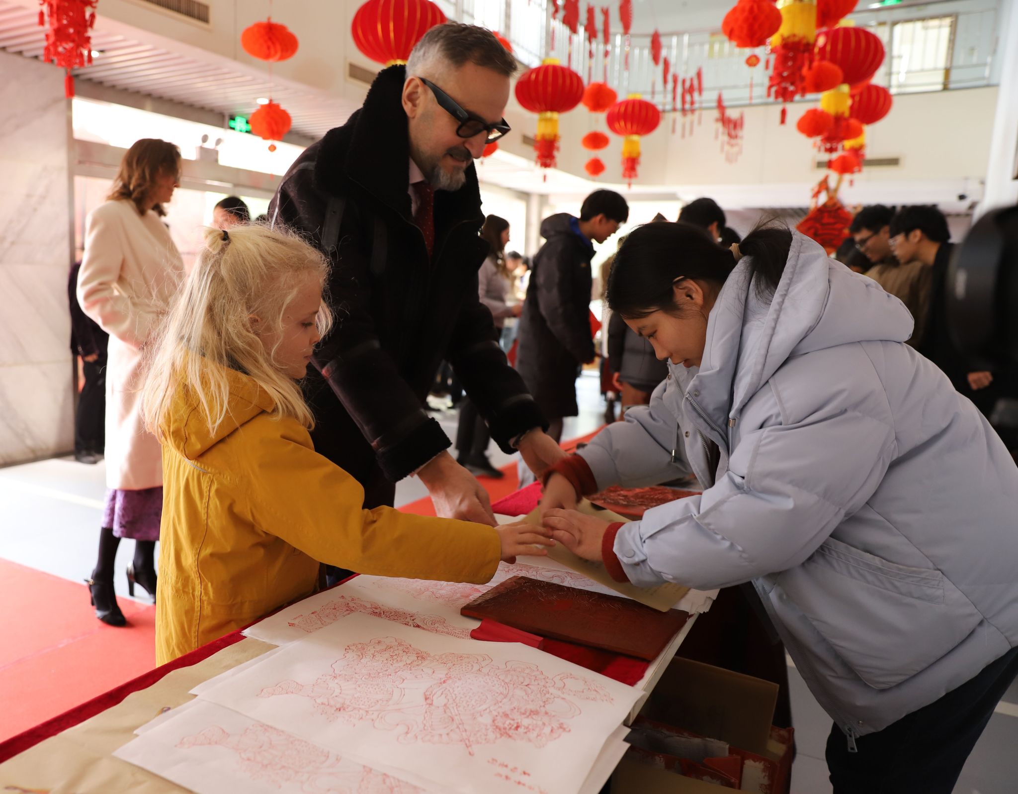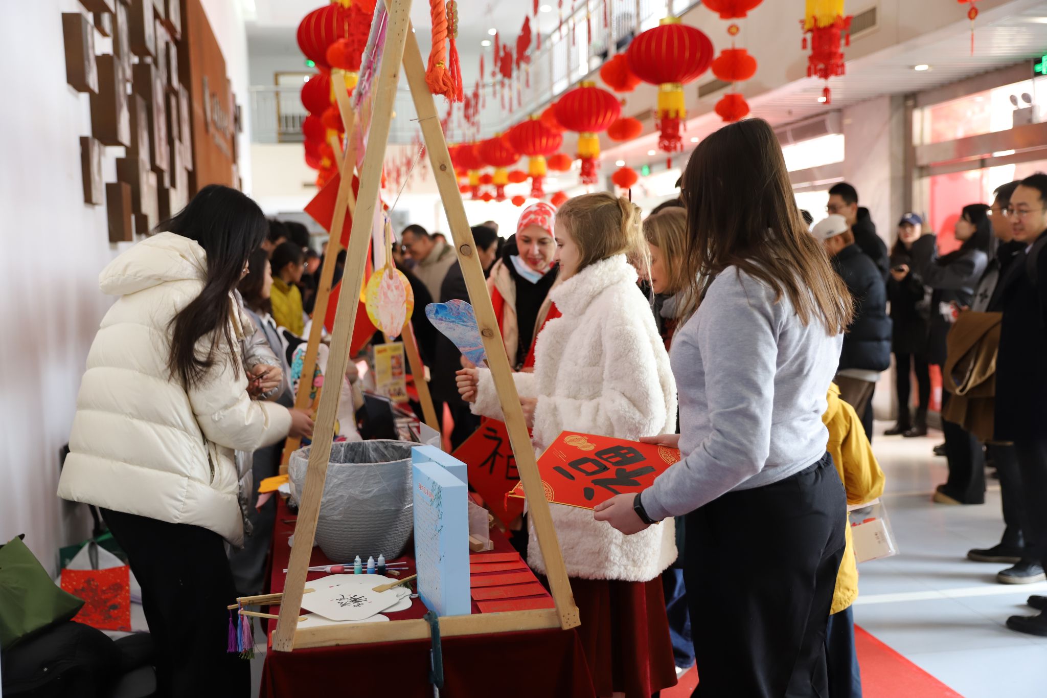 活动期间,我校团委、书法学院和艺术博物馆的师生们还设置了团扇手工制作、学写福字和年画印制等体验项目,志愿者们现场演示并指导来访嘉宾亲身体验中华优秀传统文化与非遗技艺的独特魅力,大家在互动中深深感受到中国春节的深厚文化底蕴。