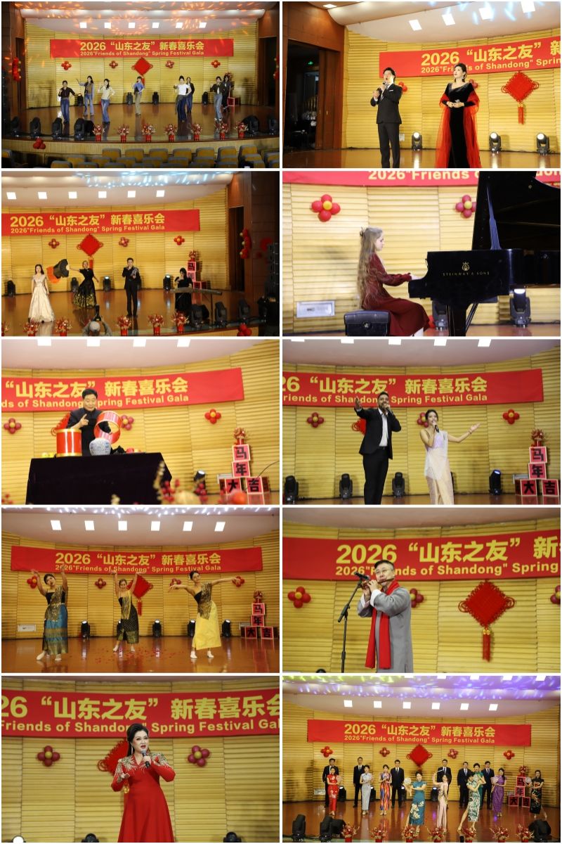 文艺演出在欢快的舞蹈中拉开帷幕,我校现代音乐学院副教授孙露、教师张学成深情演唱《不忘初心》,展现了新时代奋斗者赓续血脉、砥砺前行的精神气象;现代音乐学院副教授姜伟强的笛子独奏《扬鞭催马运粮忙》,让现场观众感受到那份藏在旋律里的丰收喜悦;戏曲与曲艺学院副教授张倩倾情演绎京剧《太真外传》《穆桂英挂帅》选段,两部经典一柔一刚,诠释了京剧的艺术魅力;著名戏法表演艺术家、省非物质文化遗产传承人张正方的传统戏法《仙人摘豆》《罗圈献彩》则诙谐有趣,方寸之间尽显乾坤妙手。罗马尼亚青少年代表安娜带来钢琴表演《月光奏鸣曲》选段、独唱《今天是你的生日》,为在场观众送上美好祝愿;驻济高校国际学生的二重唱《TAKE ME TO YOUR HEART》、泰国舞蹈、歌伴舞《奔跑》将五洲四海的美好祝福,都蕴含在动感的歌声与舞步里。省委外办青年干部带来的舞蹈《ZOOTOPIA》、歌舞乐表演《光亮》、模特队表演《外事风华 雅韵走秀》、合唱《茉莉花》《雪绒花》《最炫民族风》,展示了外事年轻干部深厚的综合素质和独特风采。中外代表欢聚一堂,节目精彩纷呈,共话深厚情谊、同迎新春佳节,处处洋溢着喜庆的节日气息。