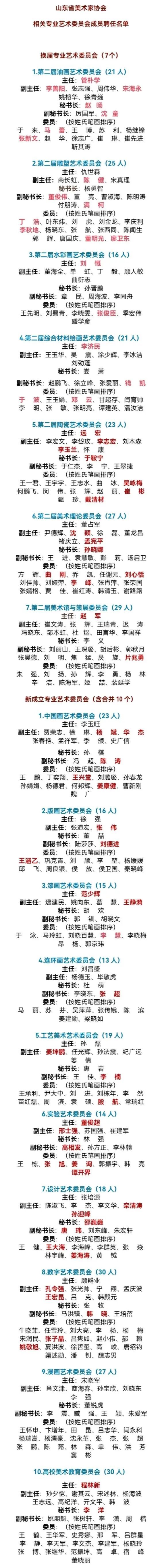 (下方为山东省美术家协会相关专业艺术委员会成员聘任名单,其中标红的为我校教师)