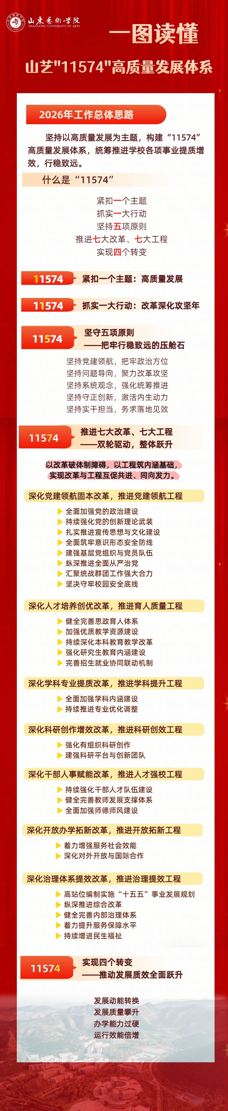 徐青峰强调,2026年是“十五五”规划开局之年,是教育强国建设三年行动计划承上启下的关键之年,更是学校乘势攀高、启新图强,全面开启现代化高水平艺术大学建设新征程的奋进之年,要坚持以习近平新时代中国特色社会主义思想为指导,全面贯彻党的二十大和二十届历次全会精神,深入落实习近平总书记关于教育、文艺工作的重要论述和对山东工作的重要指示要求,紧扣“高质量发展”一个主题,聚焦“改革深化攻坚年”一个行动,坚持党建领航、问题导向、系统观念、守正创新、实干担当“五项原则”,推进党建领航固本改革与党建领航工程、人才培养创优改革与育人质量工程、学科专业提质改革与学科提升工程、科研创作增效改革与科研创效工程、干部人事赋能改革与人才强校工程、开放办学拓新改革与开放拓新工程、治理体系提效改革与治理提效工程“七大改革、七大工程”,实现发展动能转换、发展质量攀升、办学能力过硬、运行效能倍增“四个转变”,系统构建“11574”高质量发展体系,确保“十五五”开好局、起好步。