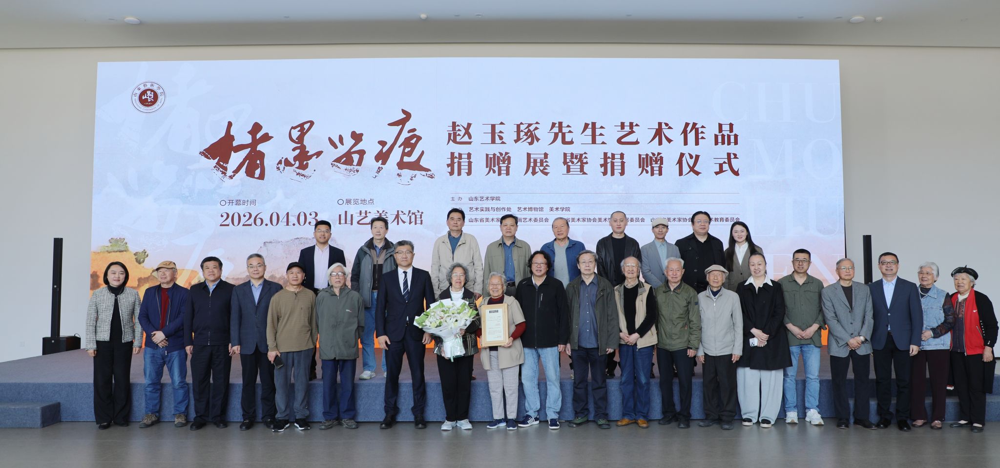 4月3日上午,楮墨留痕——赵玉琢先生艺术作品捐赠展暨捐赠仪式在山东艺术学院美术馆举行。院长徐青峰,原院长王力克,赵玉琢先生夫人赵振华,学校老教授李百钧、山东大学艺术学院副院长姚榕华等先后致辞。学校党委副书记苏茂兴,党委委员、副院长韩文涛,党委委员、纪委书记、省监委驻学校监察专员周立志,原副院长刘大力,老教授代表李振才等、赵玉琢先生家属代表、亲朋挚友代表,驻济高校与美术馆单位代表,我校退休教师、在职教师及美术学院师生代表参加仪式。仪式由副院长彭丽主持。