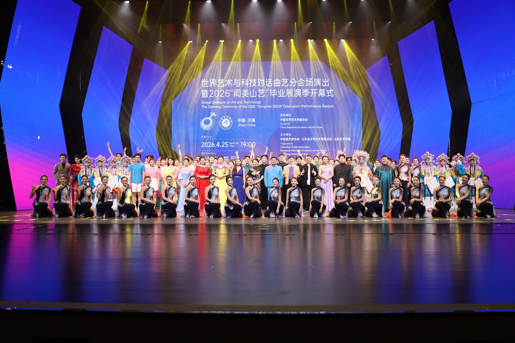 4月25日晚,2026世界艺术与科技对话曲艺分会场专场演出在长清校区大剧院举行。本次活动由中国文学艺术界联合会指导,中国曲艺家协会、山东省文学艺术界联合会、山东艺术学院联合主办。中国曲协分党组书记、驻会副主席杨发航,山东省文联党组成员、副主席于惠东,南京艺术学院党委常委、副校长张捷,山东省曲协主席慈建国,山东艺术学院党委书记徐梅,院长徐青峰,党委委员、副院长韩文涛,党委委员、纪委书记、省监委驻学校监察专员周立志,党委委员、宣传部部长孔宪坤与来自法国、美国、日本、英国、葡萄牙、意大利、罗马尼亚、斯洛文尼亚的专家学者、代表及学校师生代表等近千人齐聚一堂,共同见证传统曲艺与前沿科技的深度对话与跨界融合。
