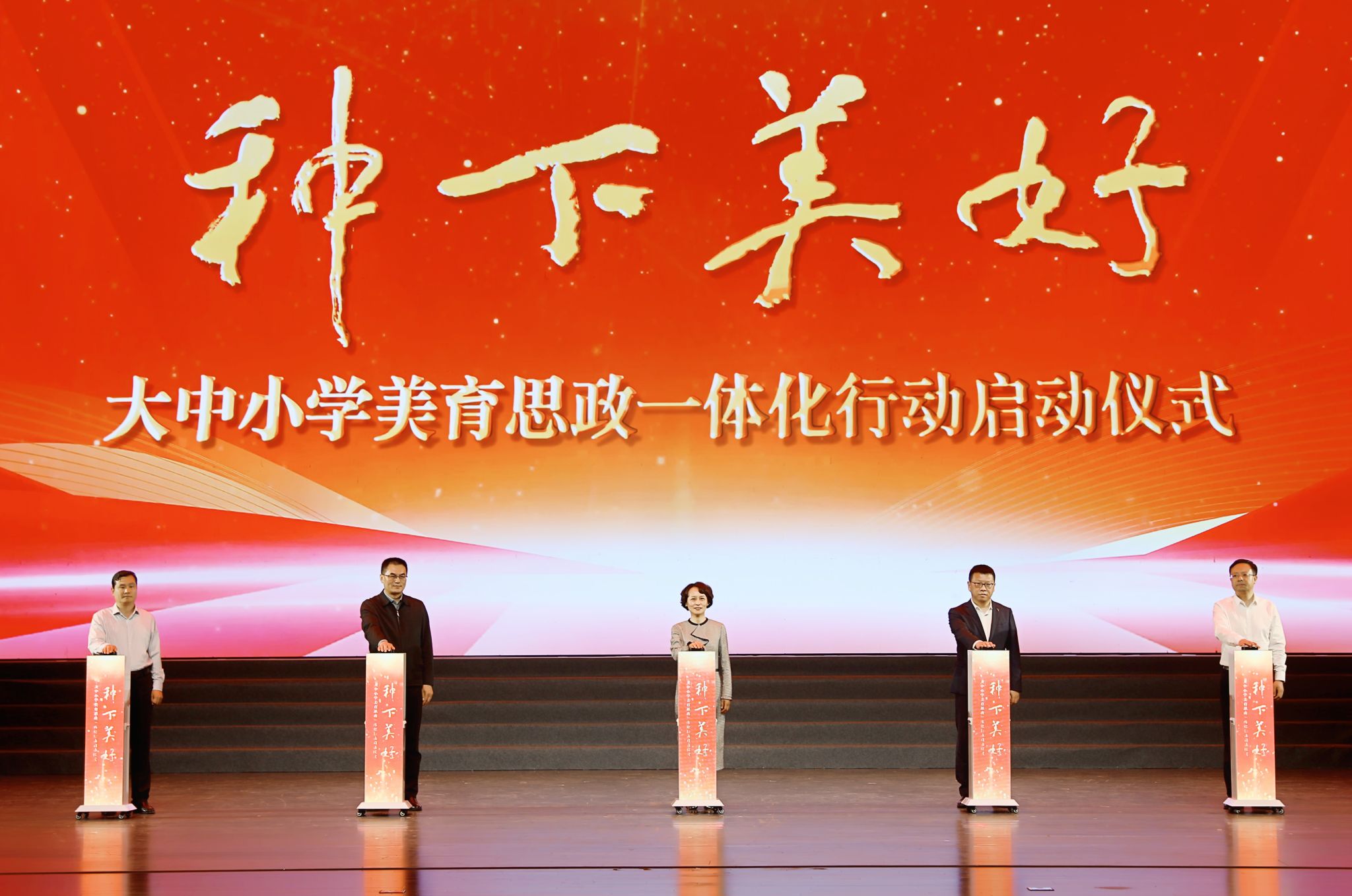 活动现场,徐梅、张晓博、王桂龙、唐金波、张绪儒共同启动“种下美好——大中小学美育思政一体化行动”。