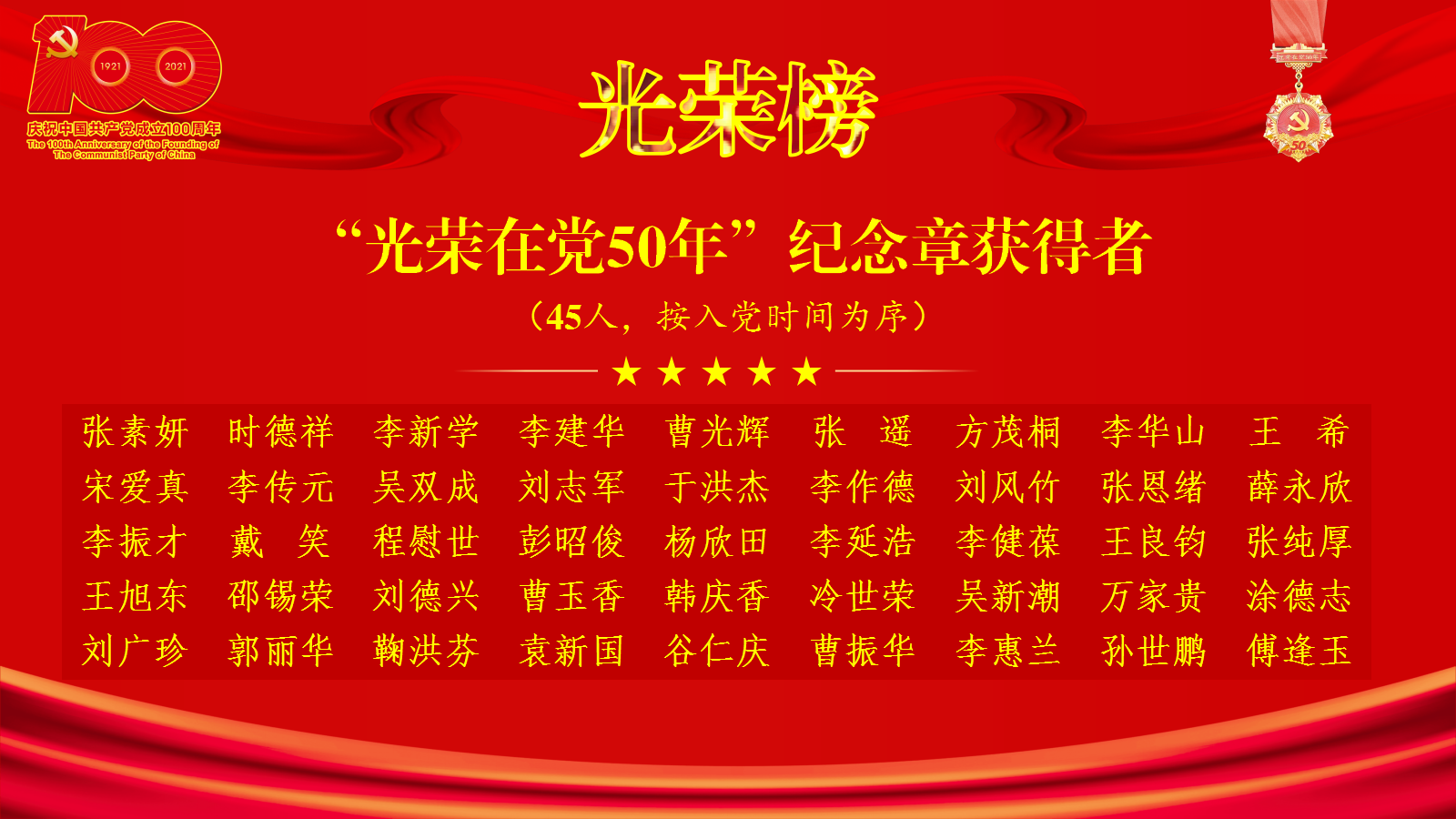 根据中共中央办公厅《关于做好“光荣在党50年”纪念章颁发工作的通知》要求,2021年首次颁发“光荣在党50年”纪念章,颁发给健在的截至2021年7月1日党龄达到50周年、一贯表现良好的党员。学校党委高度重视此项工作,经认真统计,核实表现情况、公示、集体研究,并报省委教育工委审核,学校共有45名老党员获得“光荣在党50年”纪念章。