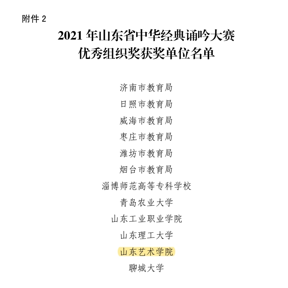 近日,省教育厅公布了2021年山东省中华经典诵吟大赛获奖作品名单,我校师生多部作品榜上有名,成绩喜人,山东艺术学院荣获优秀组织奖。