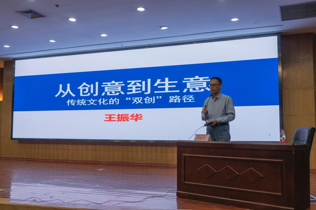 王振华以《从创意到生意——传统文化双创路径》为题,分析了文化与产品的结合方式,并以当代文创产品为例剖析了文化创意与产业结合的优势。他总结了创新思维、整合思维、用户思维三种思维方式,教育引导同学们学会分析、整合、深入挖掘受众群体及其特征,强调要注重“创意到生意的四个圈”,即政策圈、专家圈、传媒圈和生态圈,多角度、全方位展现了传统文化双创路径的有效方法与途径。