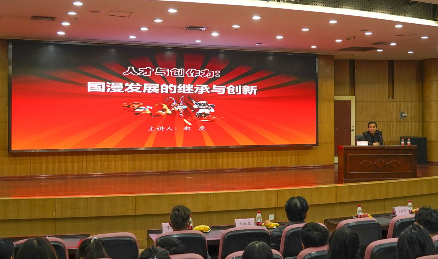 郑虎以《人才与创作力:国漫发展的继承与创新》为题,讲述了中国动画学派的历史由来及与国际动漫的交汇和发展,回顾了中国动画的发展历程。他着重分析了中国动画的门类与样式,长片、短片及电视动画系列片的特点,中国动画浓重的民族文化色彩三个方面,分享了中国动画史上经典影片的幕后故事,展现了中国动画创作力的繁荣,提出了对动画专业人才的要求,表达了对山艺学子的期望和对于未来动画产业发展的憧憬