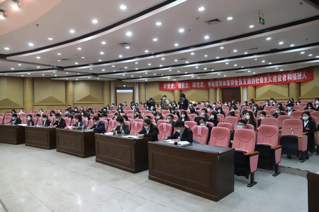 图书馆报告厅会场里悬挂着“学党史、强信念、跟党走,争做德智体美劳全面发展的社会主义建设者和接班人”的大幅标语,主席台幕布上,团徽中鲜红的团旗和“中国共青团”五个金字分外耀眼。从全校14个选举单位万余名团员青年中选举产生的121名代表参加大会。
