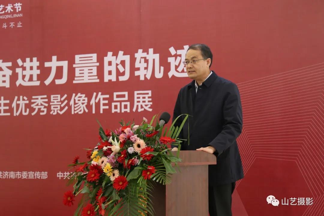 王洪禹在致辞中表示,本次影像作品展,以“信念·奋进力量的轨迹”为主题,是加强大学生思想道德建设、培树社会主义核心价值观的重要举措。山东艺术学院始终坚持“笔墨追随时代,艺术服务人民”的理念,在专业教学和艺术实践中主动融入思想政治教育,创新“艺术+思政”育人模式,打造具有山艺特色的“六艺育人”体系,将教学与实践、课堂与舞台、艺术与思政、校园与社会有机融合。通过此次展览,希望广大青年学生进一步加强交流、沟通思想,以艺术的方式唱响时代主旋律,积极拥抱新时代、奋进新时代,让青春在为祖国、为人民、为民族的奉献中焕发出更加绚丽的光彩!