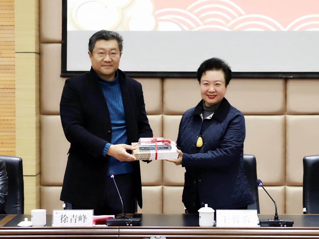 王蓉蓉教授在致辞中对学校的热忱邀请表示感谢,对“名家传戏”项目的启动表示良好的祝愿。她谈到,山东是京剧艺术的沃土,自己和山东的京剧情缘非常深厚。作为山东艺术学院的客座教授,自己将毫无保留把几十年学习、实践和研究张派艺术的收获,倾囊教授给山艺的教师和学生们,把此次“名家传戏”项目做好,为山东艺术学院戏曲专业的教学和人才培养尽自己的一份力量。随后,王蓉蓉教授将自己珍藏的京剧《状元媒》剧本、《党的女儿》黑胶唱片和《沙家浜》演出光盘赠与山东艺术学院。
