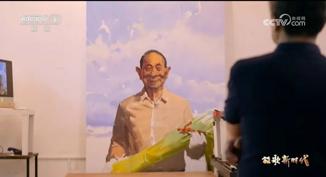(旁白)在山东艺术学院创作室,画家徐青峰正在和团队成员们一起观看“共和国勋章”获得者。袁隆平的纪录,寻找为袁隆平画像的定格瞬间。2020年,在一批重大现实主义创作题材的美术工程中,受邀创作的徐青峰一下就挑中了《“共和国勋章”获得者》这个创作任务。