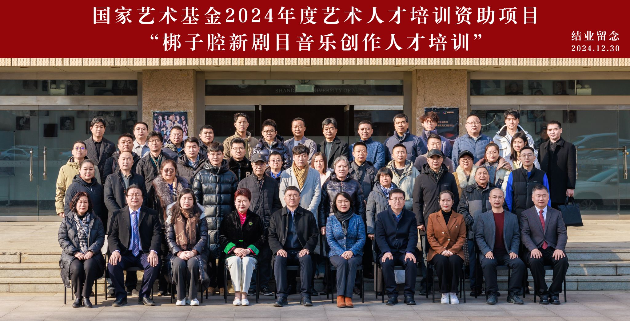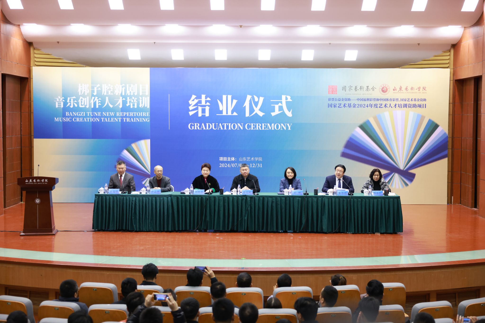 12月30日上午,国家艺术基金2024年度艺术人才培训资助项目“梆子腔新剧目音乐创作人才培训”结业仪式在学校文东校区音乐厅举行。山东省文化和旅游厅副厅长蒋庆鹏,山东艺术学院副院长彭丽,山东艺术学院原副院长、项目负责人刘晓静,山东省艺术研究院党总支副书记、办公室主任李磊,山东省戏剧家协会副主席、山东省艺术研究院戏剧影视研究所所长高志娟,山东省戏剧家协会副主席、滨州市艺术创作研究所所长臧宝荣出席仪式。学校相关处室、二级学院负责人,师生代表及该项目的30名学员参加仪式。仪式由我校艺术实践与创作处负责人主持。