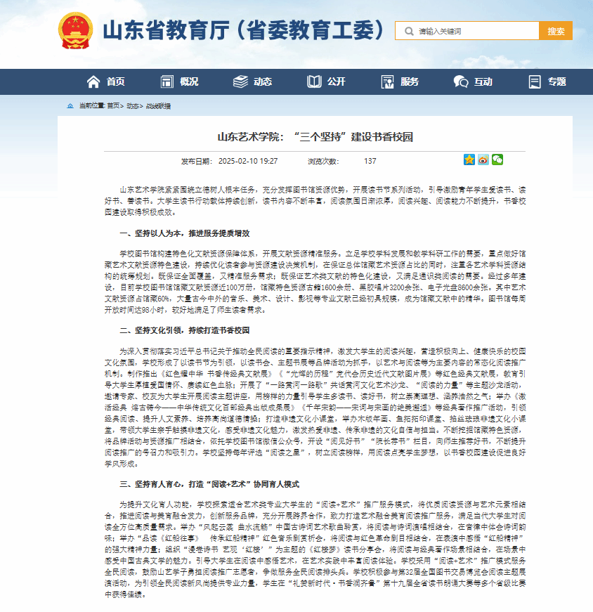 编者按:2月10日,山东省教育厅官方网站“战线联播”栏目刊登我校文章《“三个坚持”建设书香校园》,展示了我校紧紧围绕立德树人根本任务,充分发挥图书馆资源优势,开展读书节系列活动,引导激励青年学生爱读书、读好书、善读书,书香校园建设取得积极成效的经验做法。