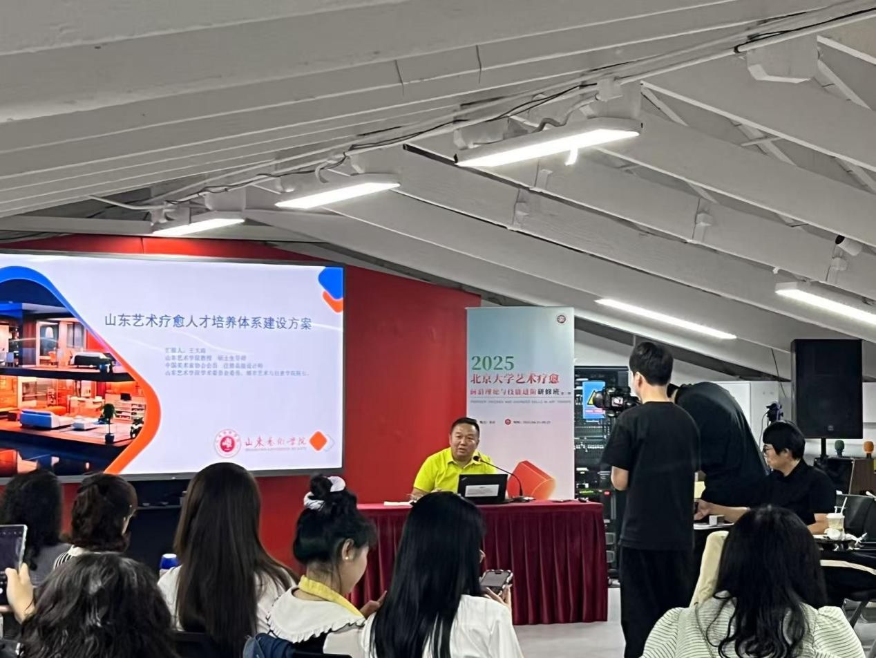 培训中,王大海以《山东艺术疗愈人才培养体系建设方案》为主题作汇报,介绍了城艺学院音乐美育艺术专业本、硕教育教学体系,以及 “山东传统音乐传承与传播” 课程群的创新特色,与专家探讨如何将山东民歌、民乐等地方非遗元素融入艺术疗愈场景,希望依托北大的学术资源与平台优势,在艺术疗愈课程建设、人才培养、实践基地共建、工作坊实施等方面深化合作。
