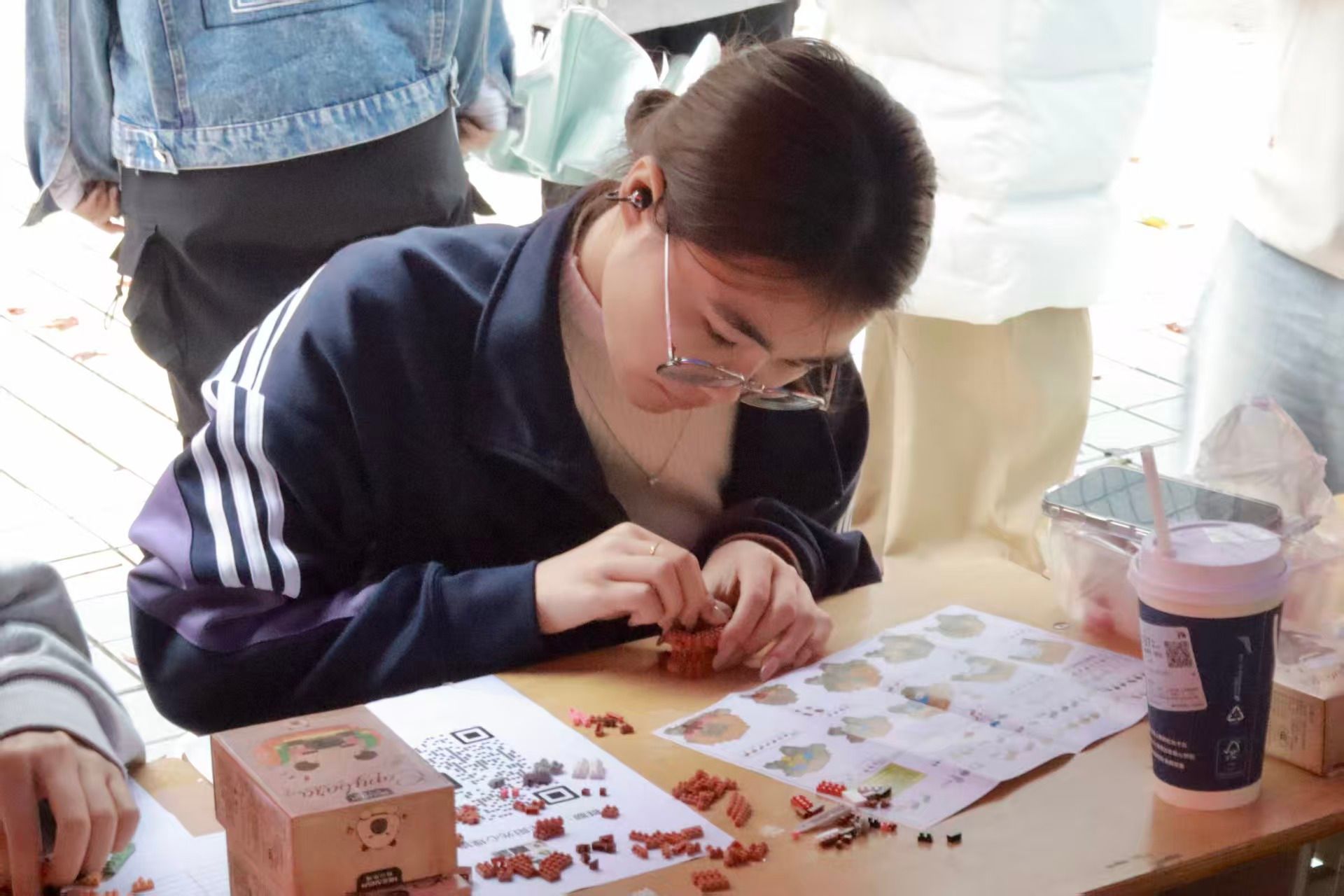 “拼搭积木”和“叶子寄语”区呈现出一派专注宁静的景象。指尖在方寸木块间构建内心秩序,于一取一放间体会情绪的平衡;将一片片落叶化为艺术贴画并写下寄语,则是一次与自我对话的秋日仪式。动静之间,情绪得以梳理,内心重获宁静。
