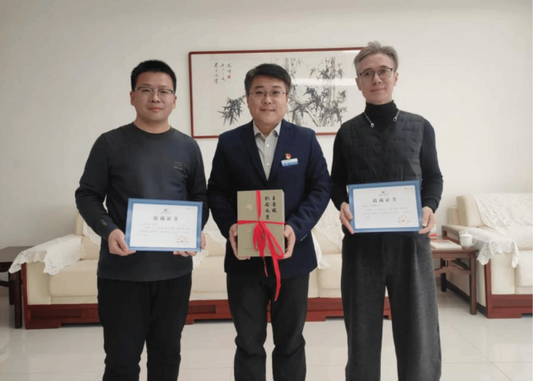 在淄博市图书馆,学校捐赠《王音旋纪念文集》等文献,淄博市图书馆党支部书记、馆长黄磊现场接收,并向捐赠方颁发收藏证书。《王音旋纪念文集》是山东艺术学院为纪念民族声乐艺术家王音旋先生逝世十周年编撰的四卷本力作,兼具文献、学术与传承三重价值。这部文集完整呈现了王音旋先生深耕民族声乐的艺术轨迹,为行业研究提供了鲜活样本。姜坤鹏向该馆捐赠了《游艺悟道》《手艺之思》《当代工艺美术评论人才培养成果集》等书籍,还发动山东艺术学院教师捐赠了近百册图书。