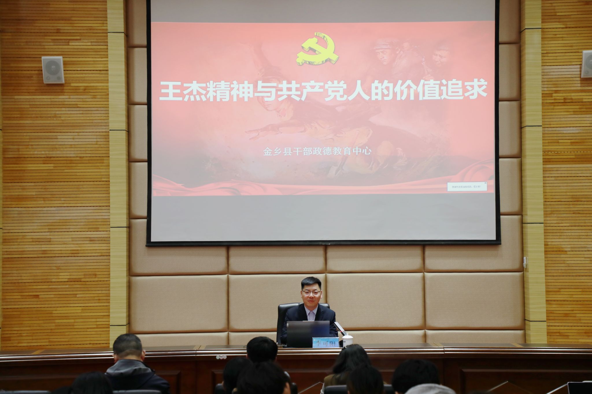 为深入推进树立和践行正确政绩观学习教育,落实党校基本培训工作,扎实开展学校党建工作领航工程,3月26日,学校党校特邀金乡县干部政德教育中心教务科科长李可阳在长清校区二楼报告厅讲授“王杰精神与共产党人的价值追求”专题党课。党课由党委组织部副部长、正处级组织员、机关党委书记张磊主持。各学生党支部书记、学生党员代表100余人参加学习。